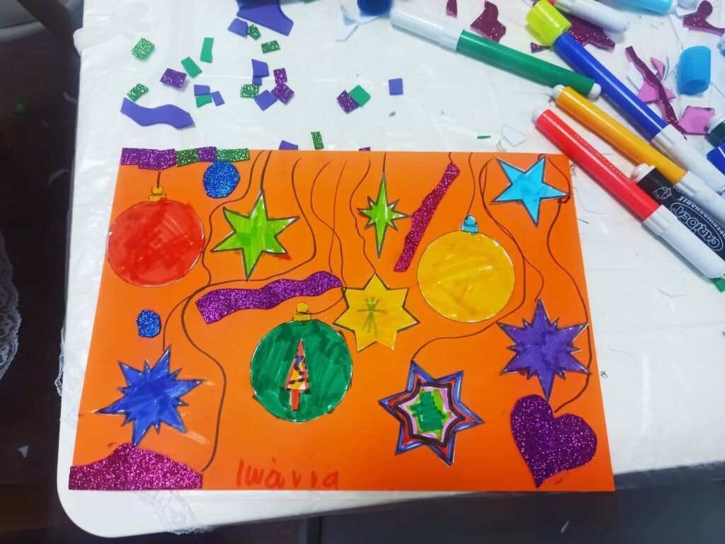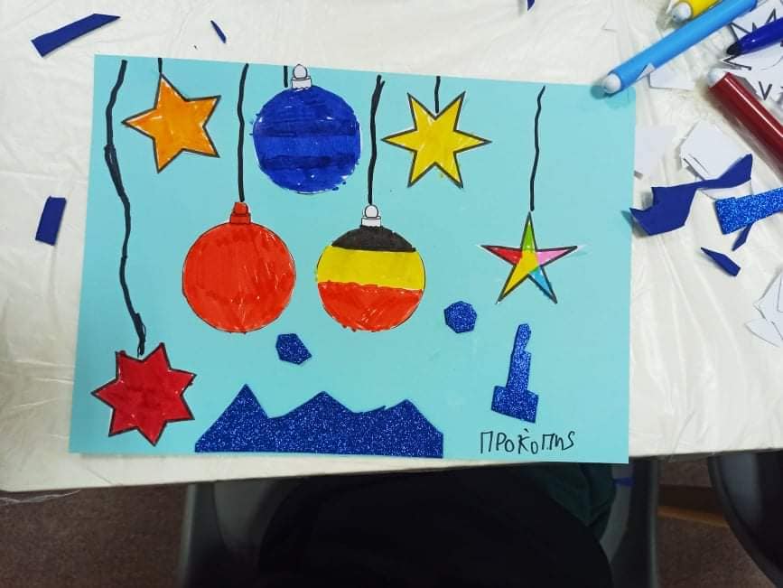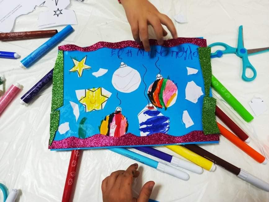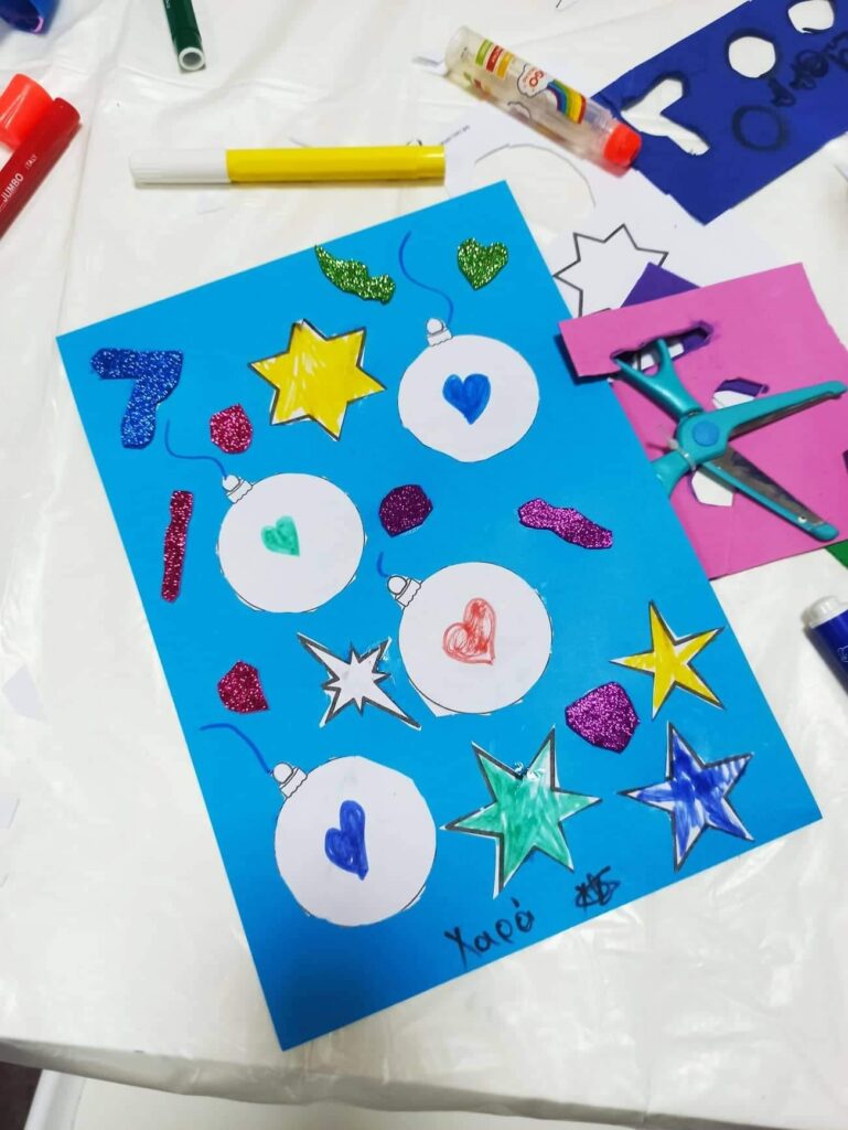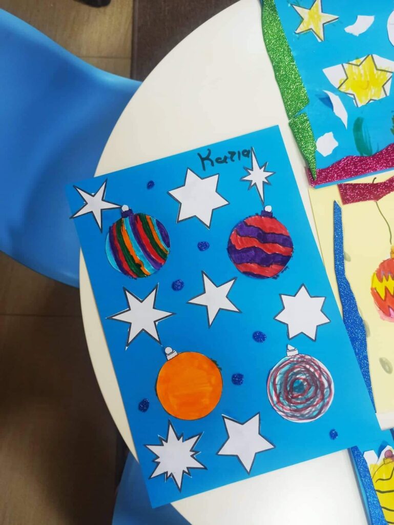 Στο σημερινό μάθημα ζωγραφικής φτιάξαμε τις δικές μας μοναδικές χριστουγεννιάτικες κάρτες!! Κόψαμε χαρτί σε σχήμα αστεριών και μπάλες Χριστουγέννων. Στη συνέχεια τα χρωματίσαμε, τα στολίσαμε και τα κολλήσαμε πάνω σε χαρτόνι.