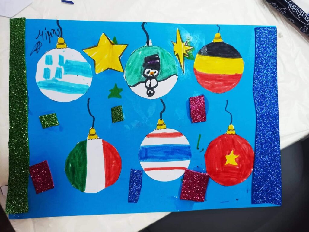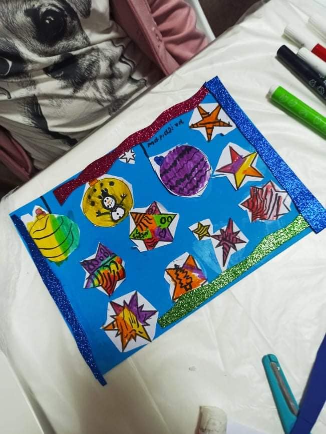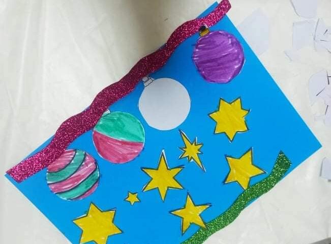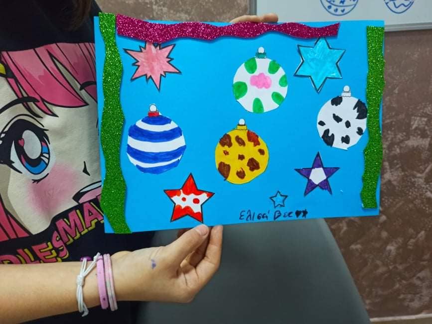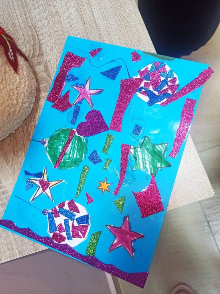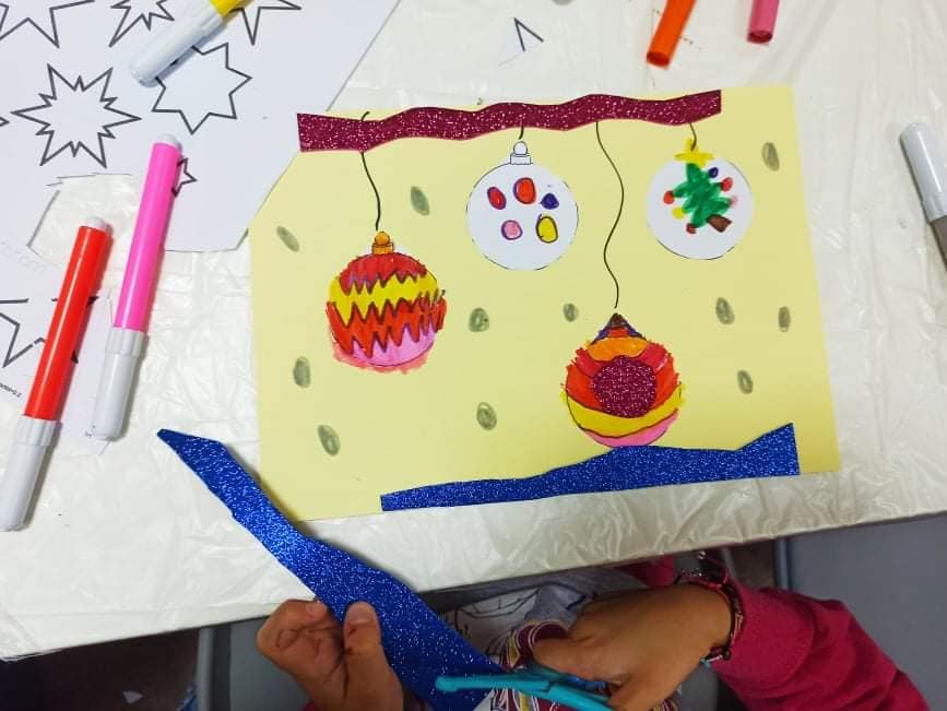 Στο σημερινό μάθημα ζωγραφικής φτιάξαμε τις δικές μας μοναδικές χριστουγεννιάτικες κάρτες!! Κόψαμε χαρτί σε σχήμα αστεριών και μπάλες Χριστουγέννων. Στη συνέχεια τα χρωματίσαμε, τα στολίσαμε και τα κολλήσαμε πάνω σε χαρτόνι.