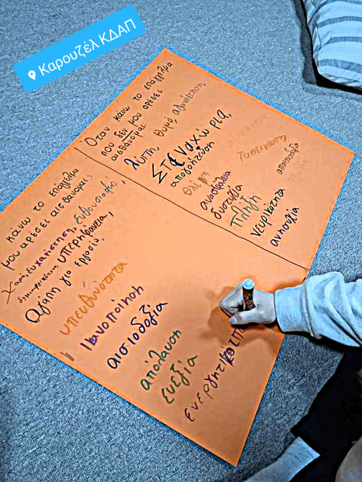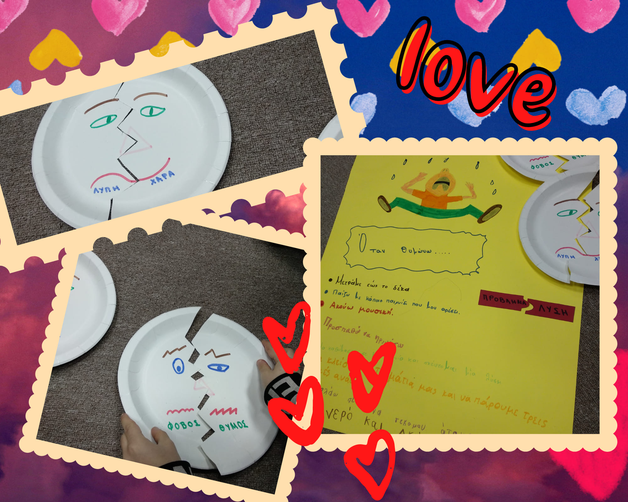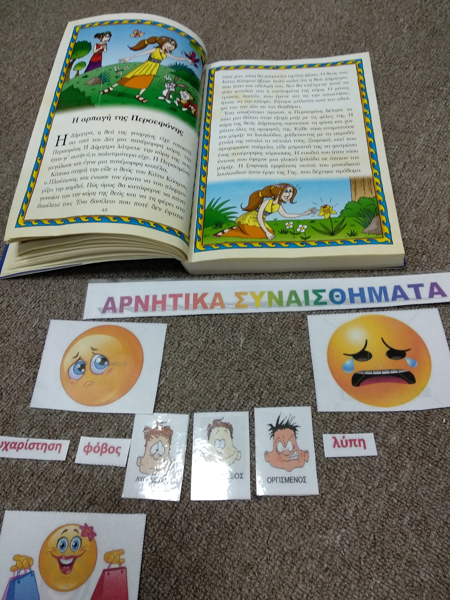 Συνδέσαμε τους Θεούς με τα συναισθήματα.Η αρπαγή της Περσεφόνης, ένας μύθος γεμάτος συναισθήματα! Πώς ένιωθαν η Δήμητρα, η Περσεφόνη, ο Άδης και οι άλλοι θεοί;Χωριστήκαμε σε ομάδες και ζωγραφίσαμε τα συναισθήματα:Θυμώνω, όπως ο Δίας.Αγαπώ, όπως η Αφροδίτη.Μισώ, όπως ο Άρης.Ζηλεύω,
